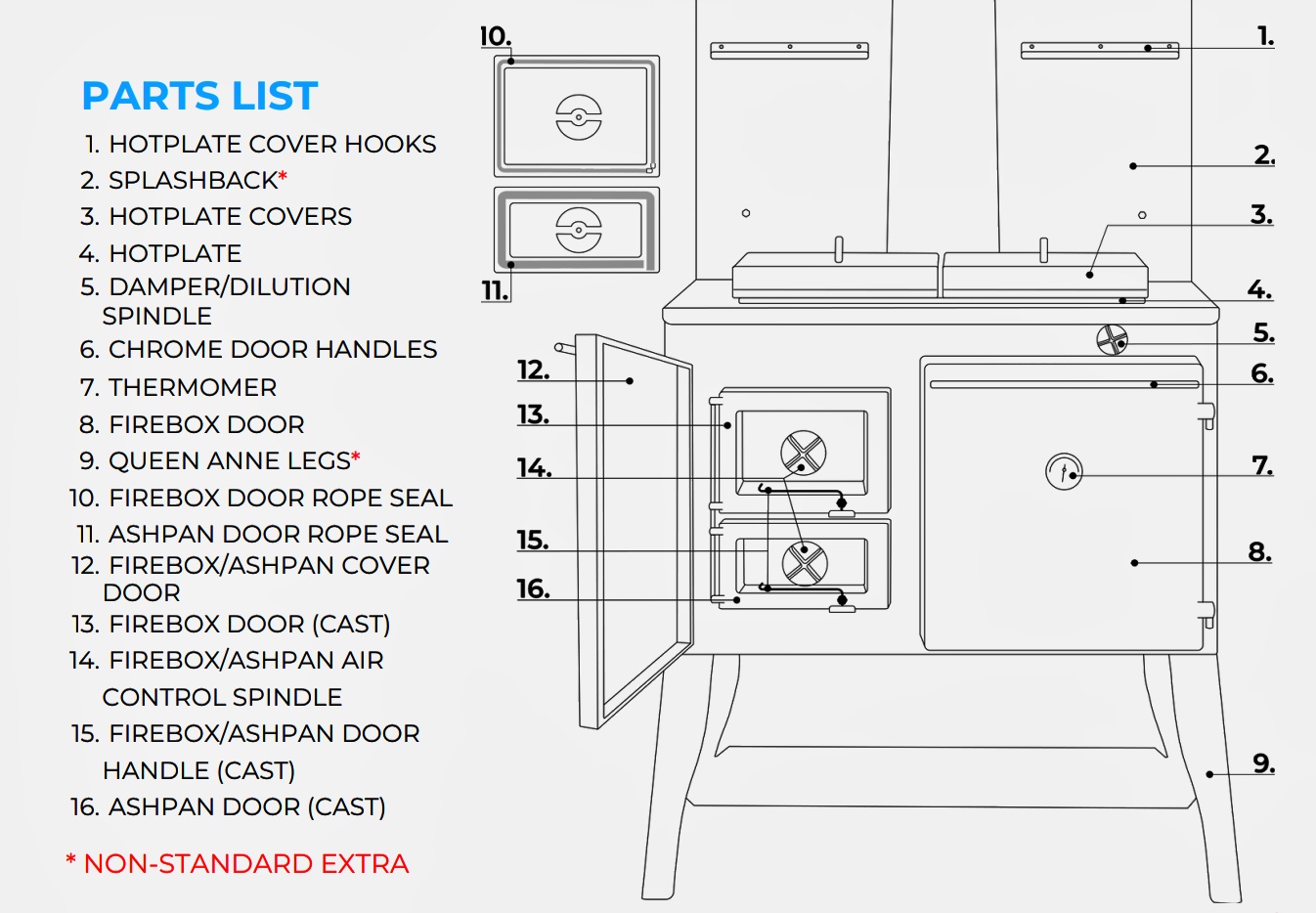The original unit consists of a single oven, large cooktop with lift off hot plate covers, firebox with 5kw hot water jacket for domestic hot water, an ashtray and has a centrally located flue. Other additional bespoke options include: