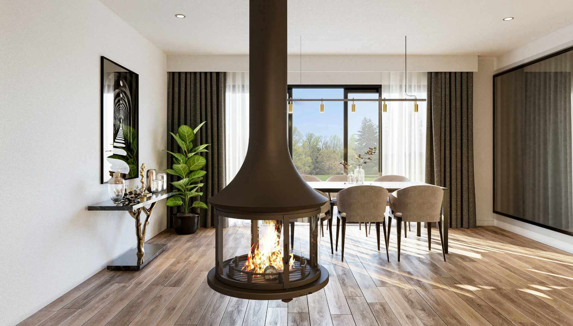 Suspended from the ceiling, the JC Bordelet Lea 998 not only enhances ambiance but also transforms the atmosphere of a room. With its meticulously hand-sculpted design, this fireplace delivers both aesthetic satisfaction and functional brilliance. As the smallest model in the JC Bordelet range, it is ideal for those who desire the beauty of a hanging central fire in a more compact setting.